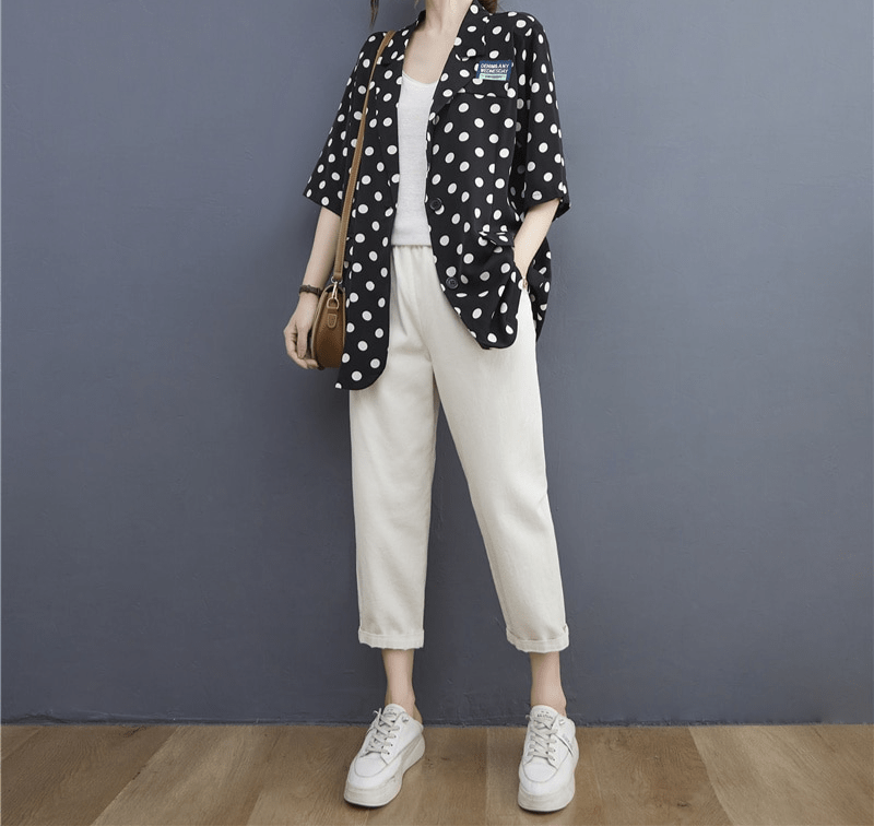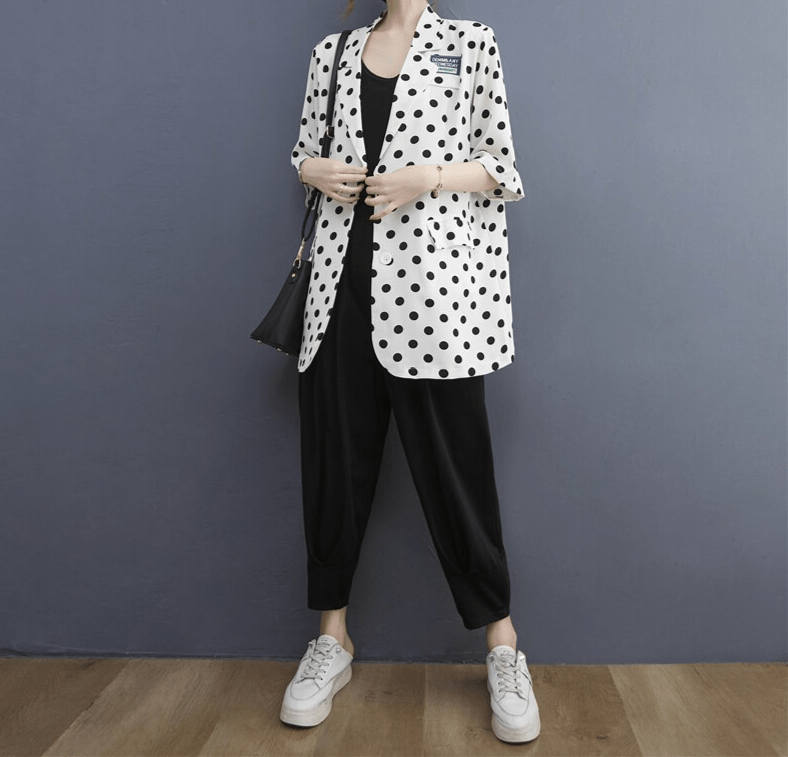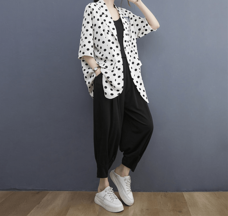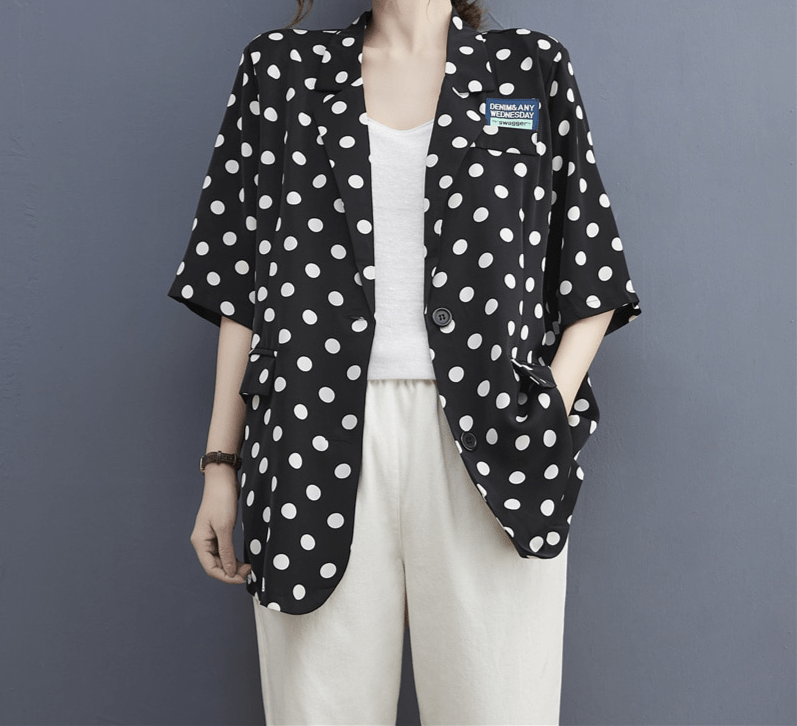 Le motif à pois est un classique de la mode, toujours en vogue.😎 Ce blazer vous permet d’adopter un style rétro et élégant, tout en restant tendance. Les pois apportent une touche d’originalité et de féminité à votre tenue, vous démarquant avec subtilité.