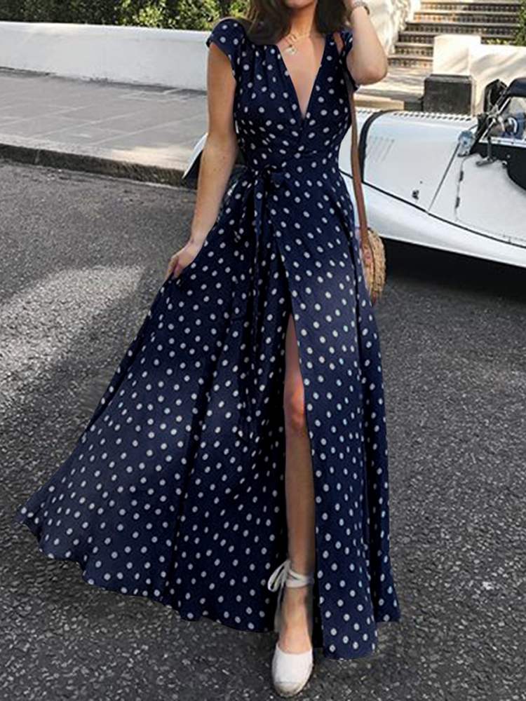 La robe longue à pois est un incontournable de la mode bohémienne. Avec son col en V, ses manches courtes et son ourlet fendu, elle vous assure un look à la fois sexy et décontracté. 😄 De plus, la ceinture permet de marquer votre taille et de mettre en valeur votre silhouette.