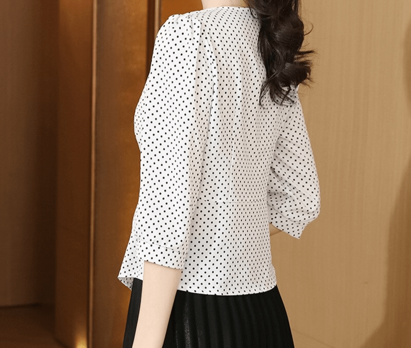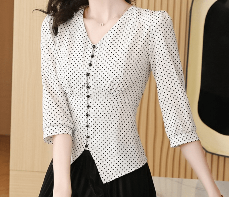 Avec cette Chemise Imprimée à Pois pour Femme, Col en V, lèvent, Coupe Cintrée, Courte, Irrégulière et Manches sulf au bureau 2634 vous serez la reine de la séduction. Vous avez raté ce dossier important ? Pas de soucis ! C’est sûrement parce que vos collègues étaient trop distraits par votre style irrésistible. 😏 Peur du jugement des autres ? Avec une telle chemise qui oserait vous critiquer ?! 🙅♀️ Et si quelqu’un doute encore de votre sens du style… montrez-leur simplement comment on fait avec cette pièce unique dans votre garde-robe. 👗 Alors n’attendez plus ! Faites taire les mauvaises langues et affirmez-vous avec panache grâce à cet achat malin. 💃