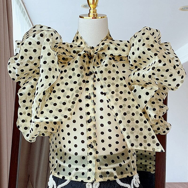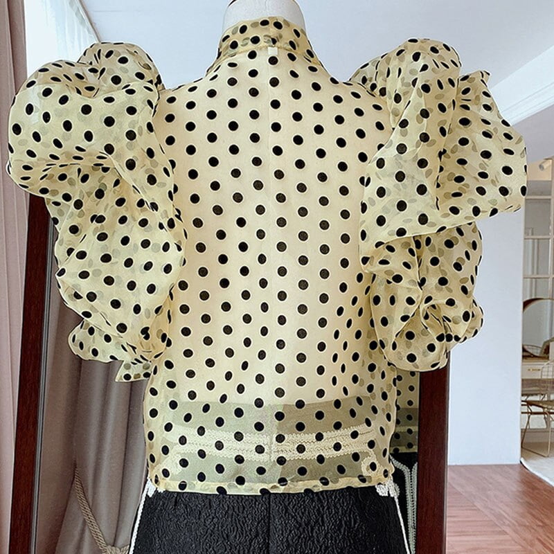 Avec ce chemisier transparent à manches bouffantes, vous serez la reine de la séduction, même si votre dernier rendez-vous a été un fiasco. 🙈 Pas besoin de chercher une excuse pour vos échecs passés, ce haut chic et sexy est là pour effacer toutes les erreurs du passé. 👑 Vous avez peur d’être trop audacieuse ? Ne vous inquiétez pas, l’organza à pois apporte juste ce qu’il faut de piquant sans tomber dans le vulgaire. Et si quelqu’un ose critiquer votre style, rappelez-lui simplement que c’est vous qui portez le col à nœud et non lui ! Alors mesdames, prêtes à faire tourner des têtes ? 💃🏻