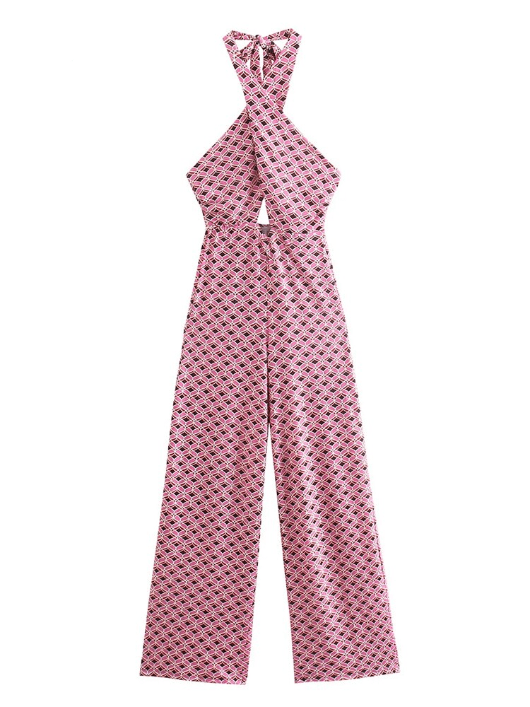 Combinaison Dos Nu Géométrique Jambe Large Rose – Salopette Rétro