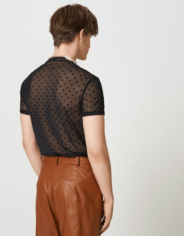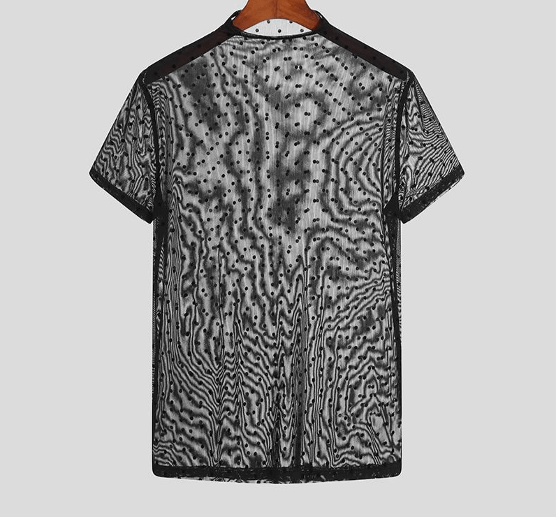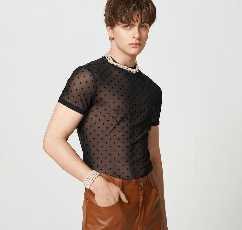 Découvrez le t-shirt col roulé à manches courtes pour homme, une pièce unique qui allie confort et élégance. 🎩 Ce vêtement est conçu en maille transparente, avec un imprimé à pois qui lui confère une touche d’originalité. Idéal pour les hommes modernes qui aiment se démarquer, ce t-shirt est parfait pour toutes les occasions, que ce soit pour une fête ou simplement pour sortir dans la rue.