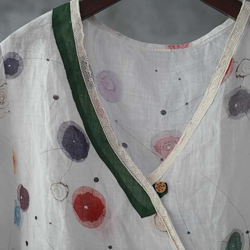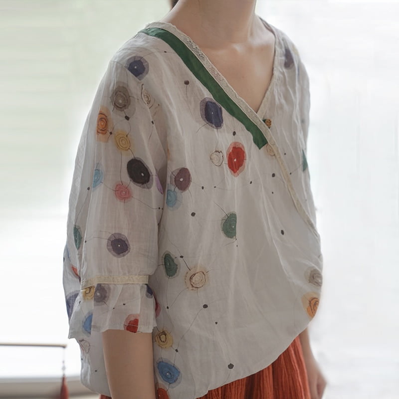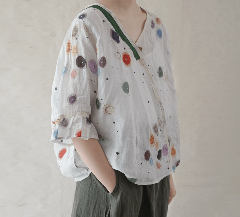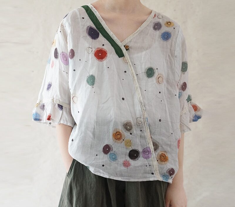 Avec son patchwork à pois Ramie 🎀, ce t-shirt offre un look rétro-chic qui ne passera pas inaperçu. Les manches évasées ajoutent une touche de féminité tandis que le col en V met subtilement en valeur votre décolleté. Que vous assistiez à un mariage ou que vous profitiez d’une journée d’été décontractée, ce t-shirt vintage s’adapte parfaitement à toutes les occasions.