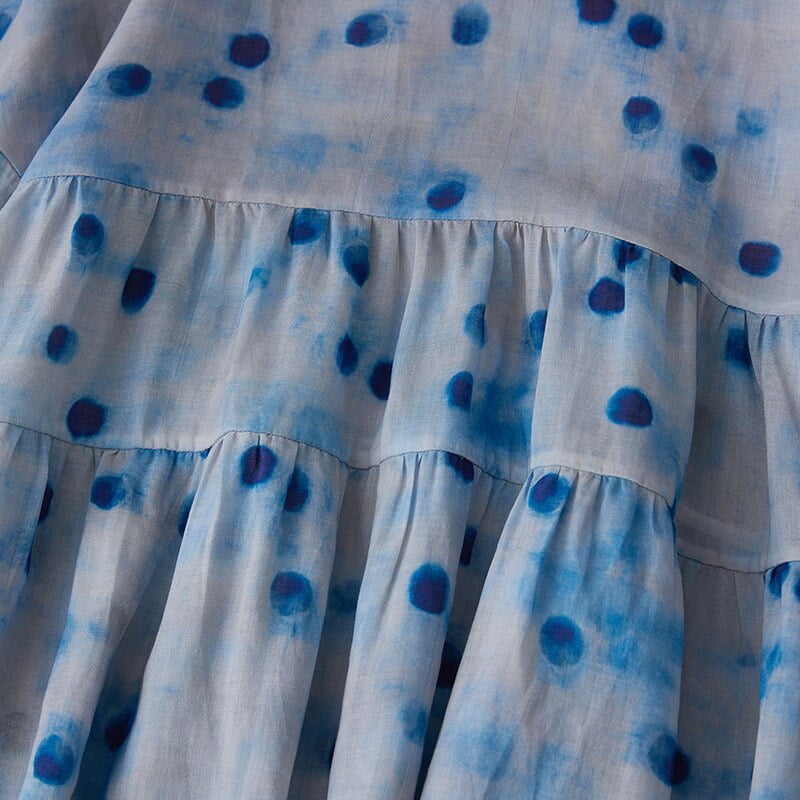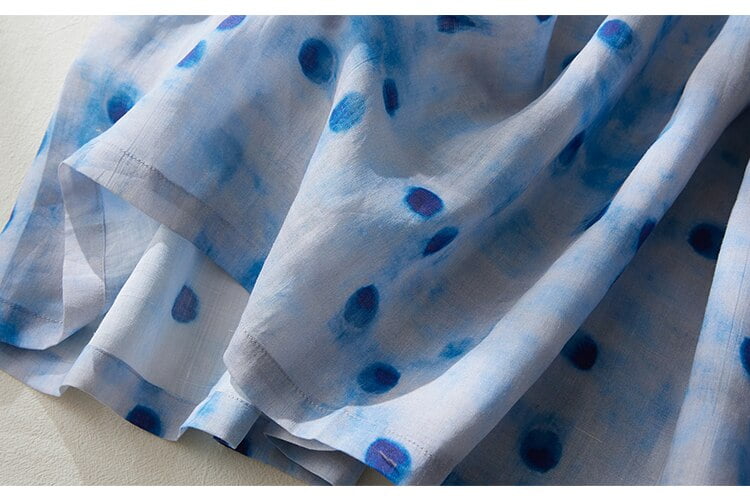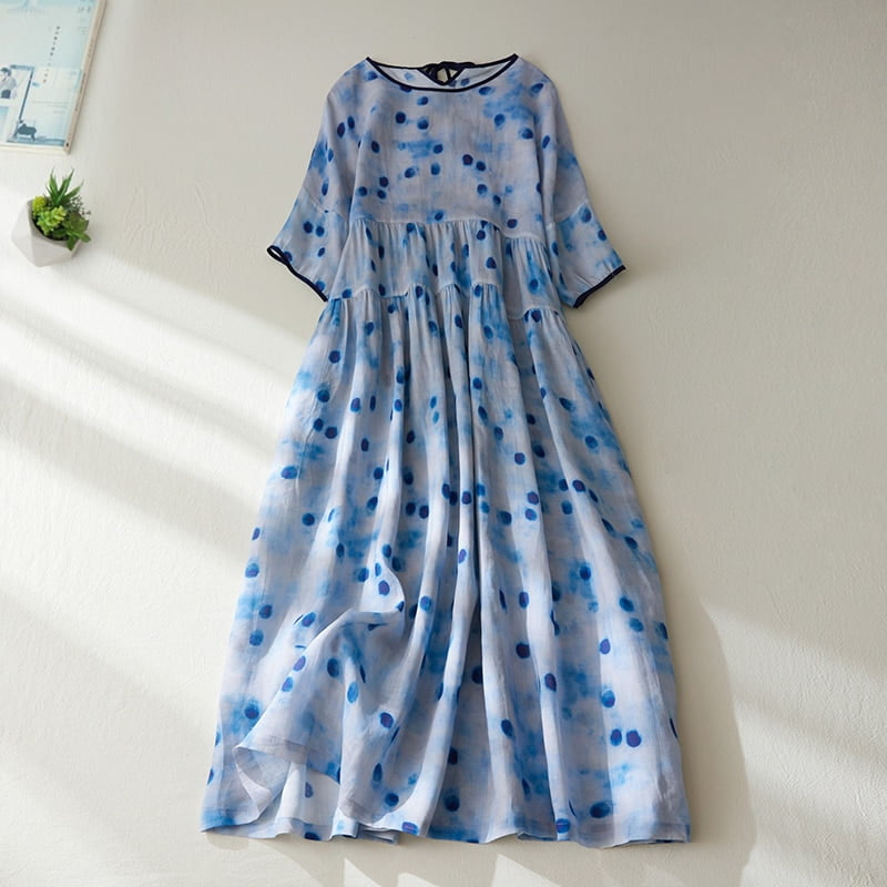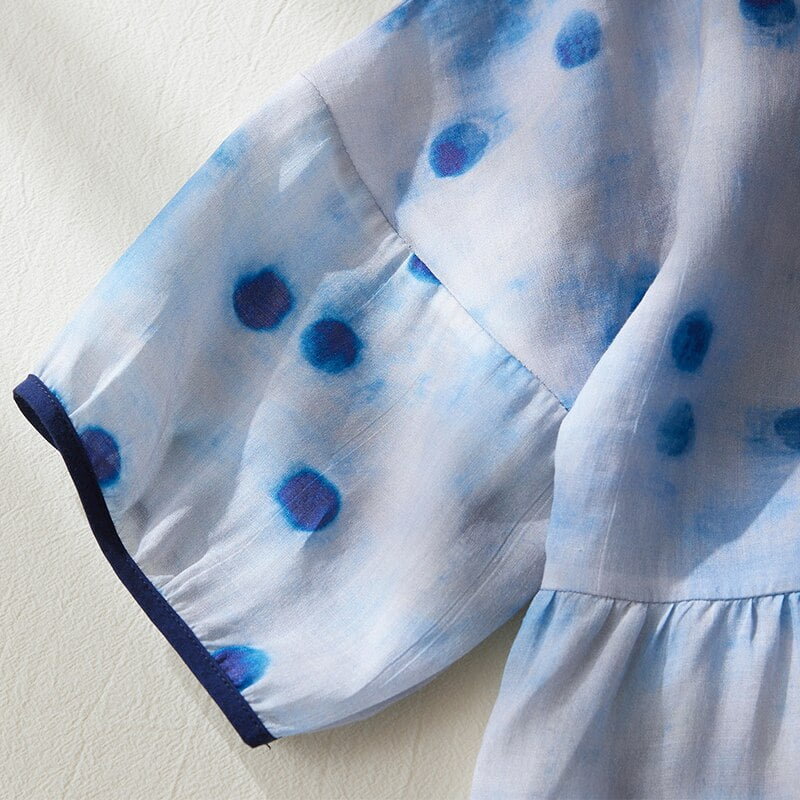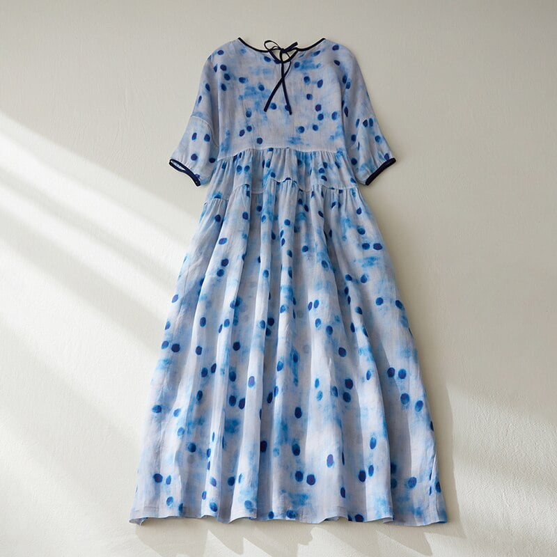 La Limigyyue est une robe mi-longue pour femme en lin et coton, avec une coupe ample et confortable. Elle présente une teinture par nouage, des manches courtes et un design patchwork.