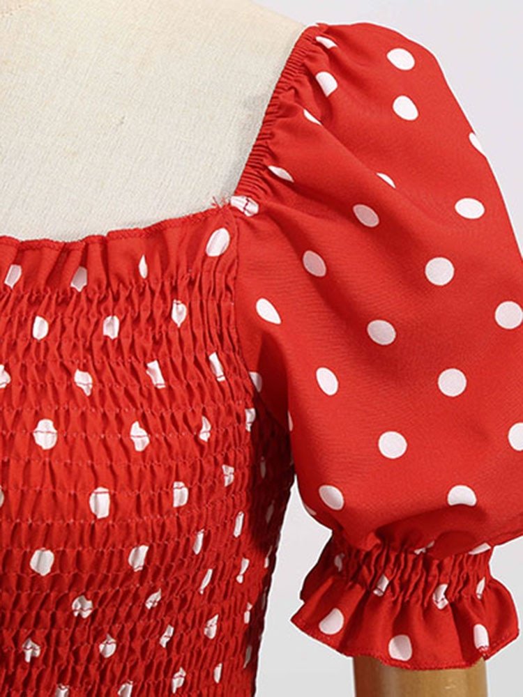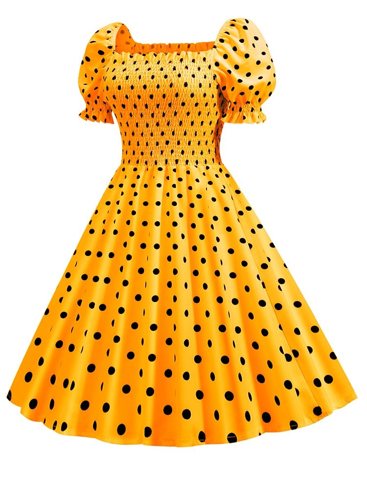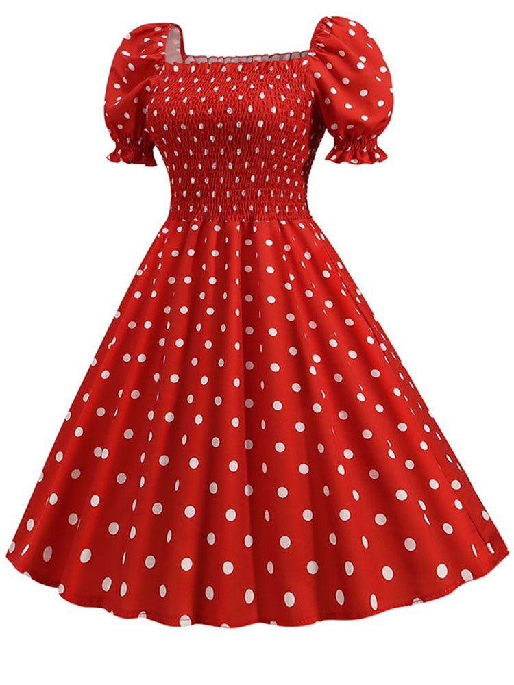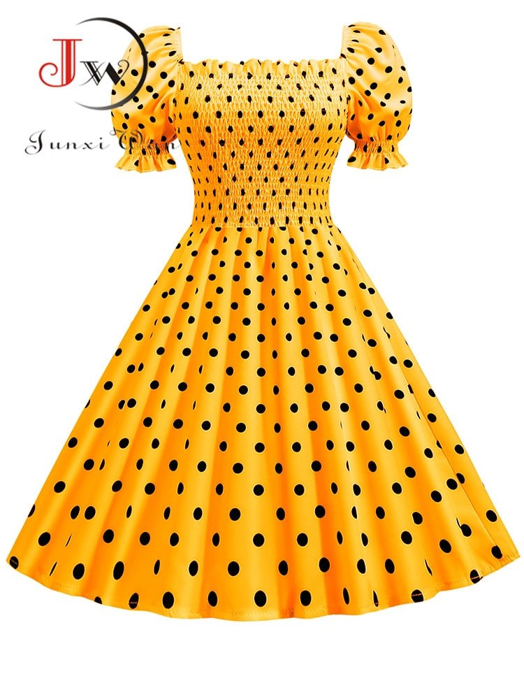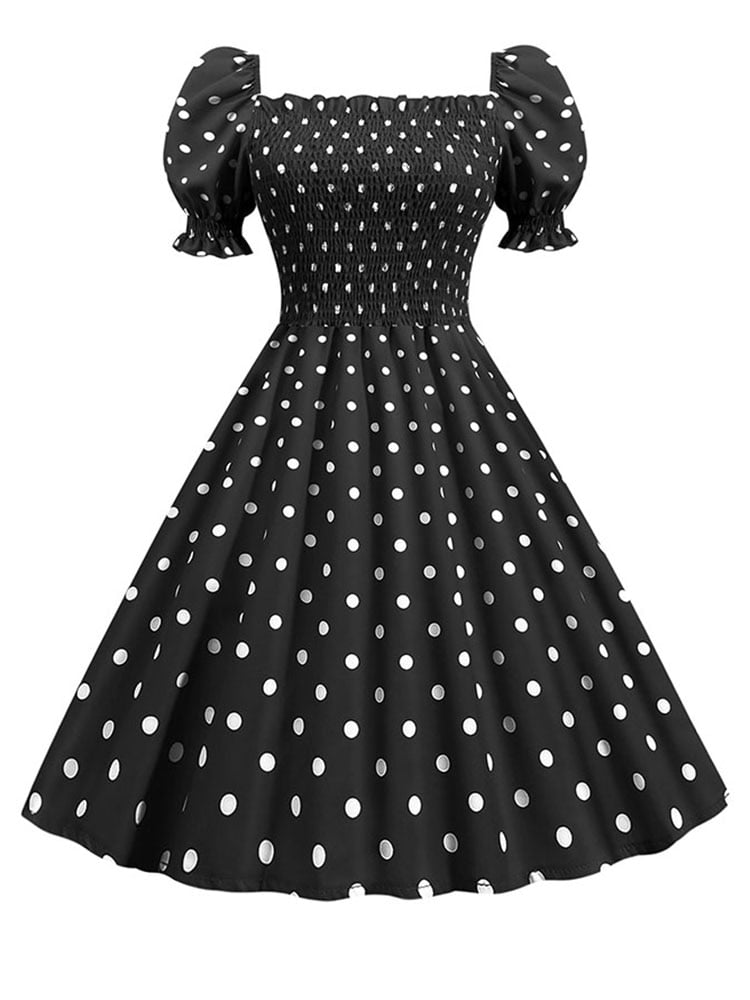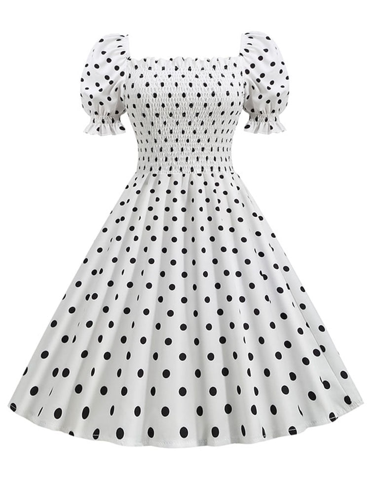 Cette robe de soirée élégante pour femme présente un motif à pois, des manches courtes bouffantes et un col carré. Elle est de style vintage et convient pour les occasions décontractées, la plage et l’été.