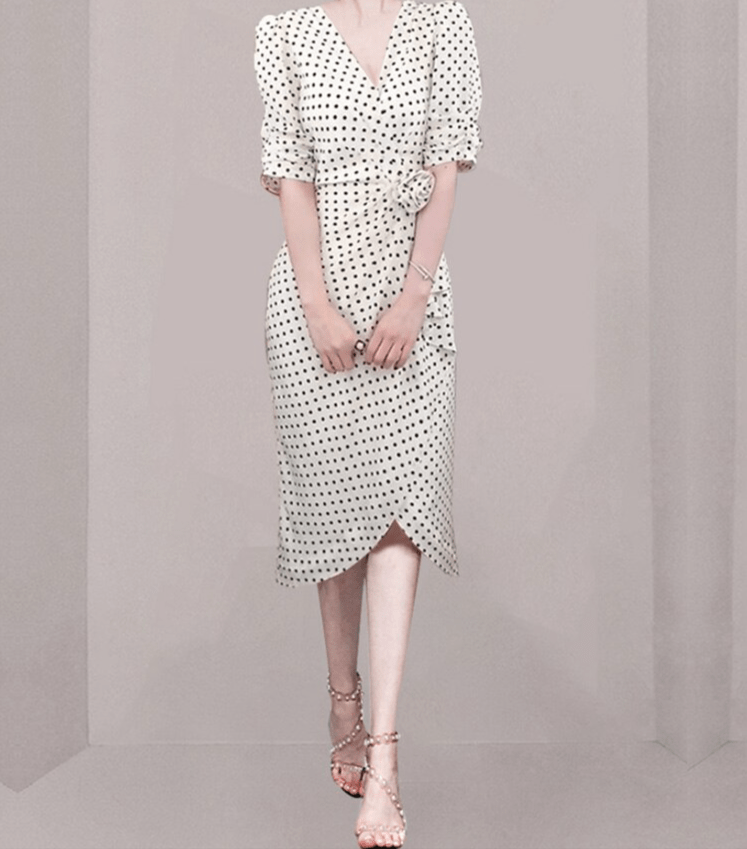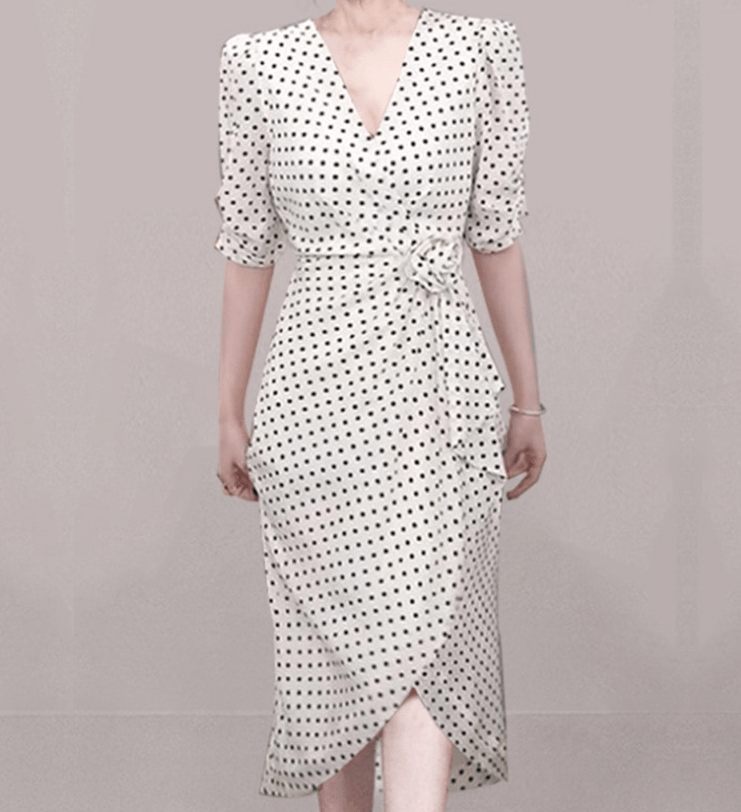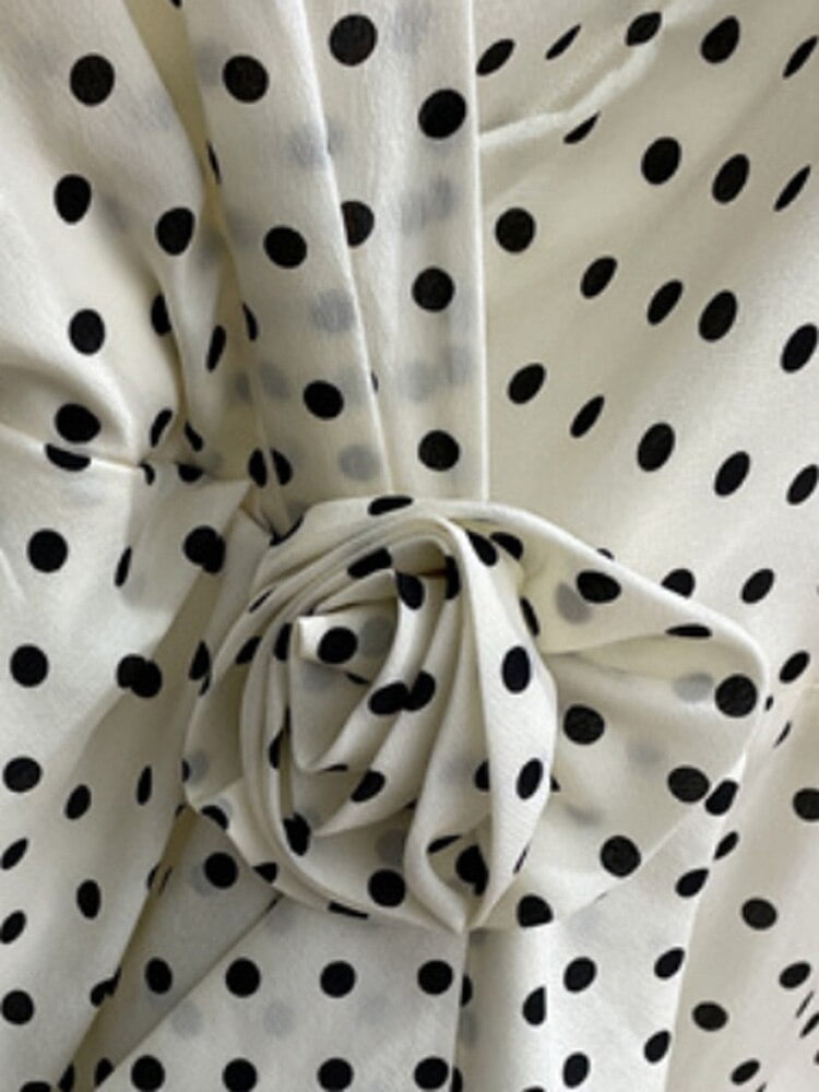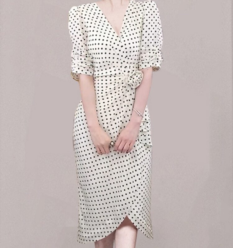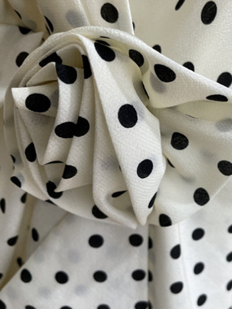 Robe de soirée élégante pour femme avec col en V et manches mi-bouffantes. Dotée d’un nœud décoratif à pois, idéale pour l’été 2022.
