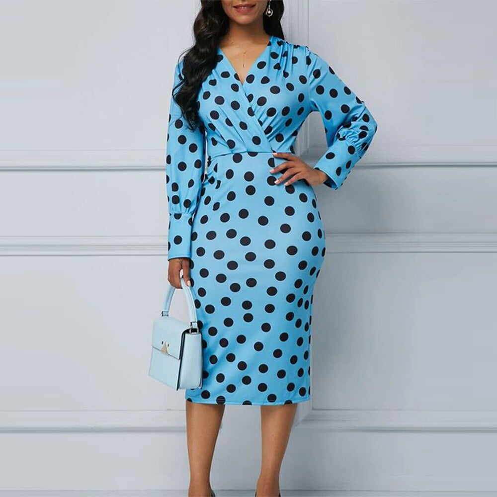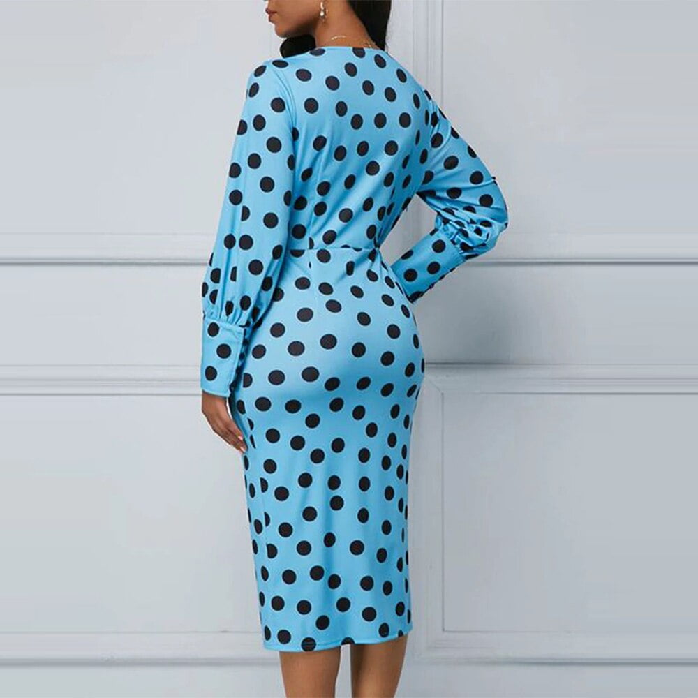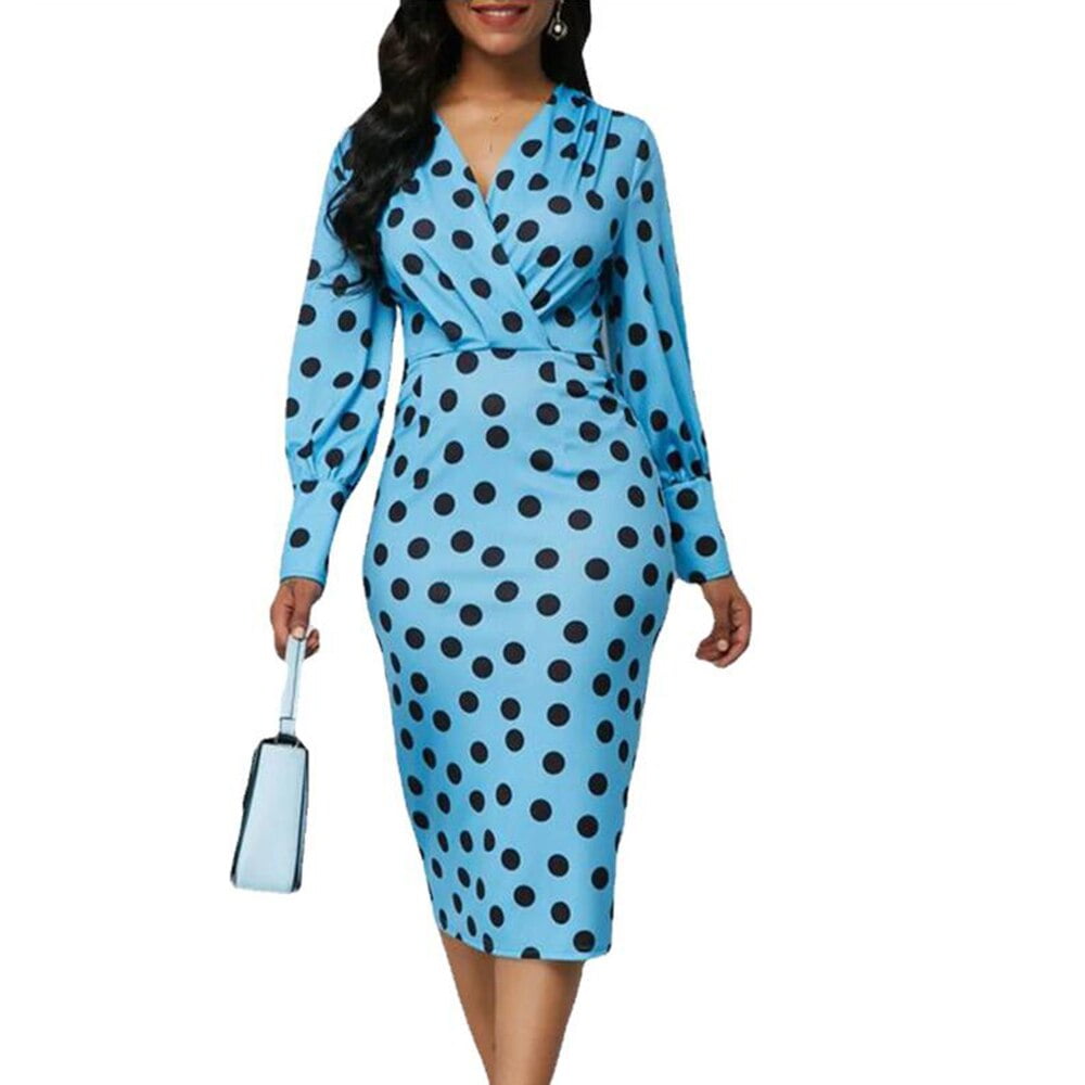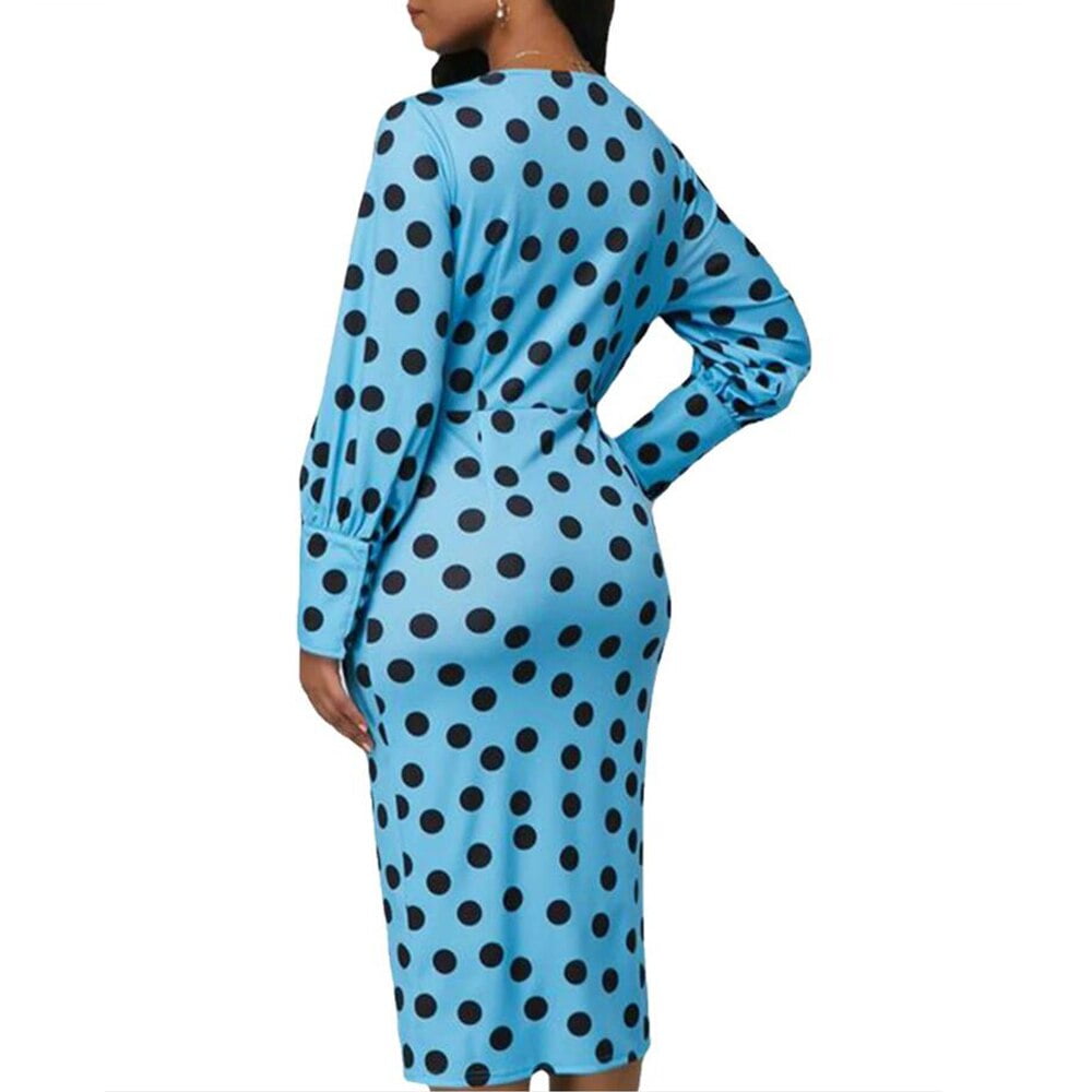 Cette robe de soirée pour femme présente un motif à pois, un col en V et des manches sulf. Elle est élégante, sexy, de couleur bleue et convient pour le bureau ou les occasions spéciales.