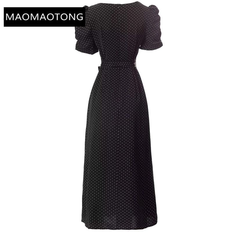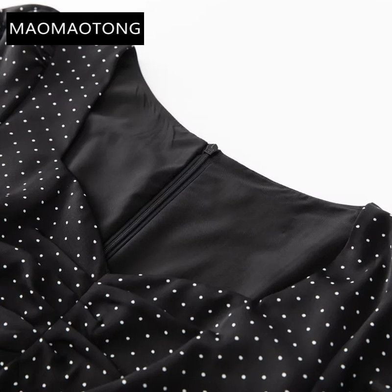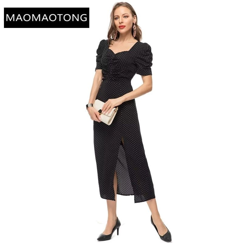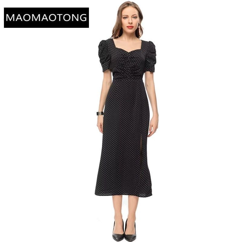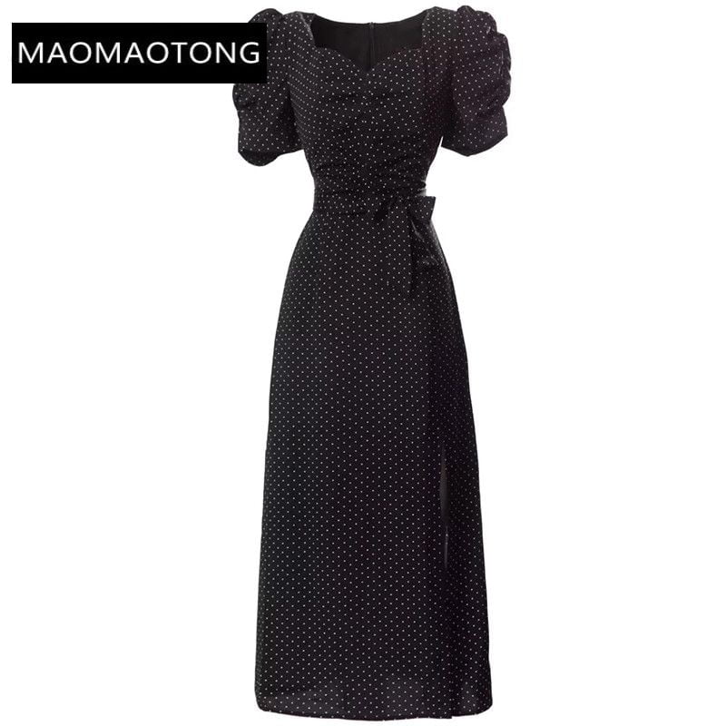 Cette robe à pois pour femmes est une création de luxe de haute qualité pour 2023, avec un col carré, des manches courtes bouffantes et une fente au niveau des fessiers. Elle est idéale pour les événements de piste et les occasions élégantes.